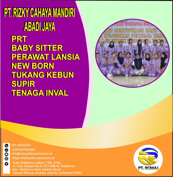 PT. Rizky Cahaya Mandiri Abadi Jaya perkasa adalah salah satu lembaga Pelatihan dan penempatan tenaga Kerja Rumah Tangga dan baby sitter Indonesia yang mencakup pelayanan area Jabodetabek , memberlakukan Sistem Tanpa Potong Gaji karena potong gaji adalah ketidakadilan bagi para pekerja.